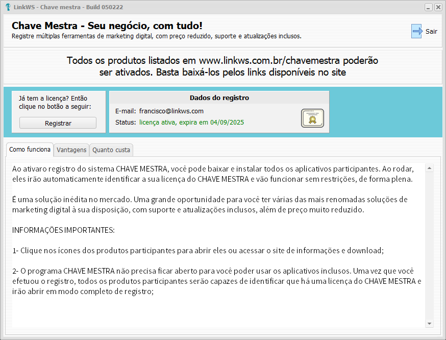 Agradecemos seu interesse na Chave Mestra. Com um único registro, tenha acesso ao que temos de melhor em ferramentas de marketing digital, com suporte e atualizações inclusas durante todo o período da licença.